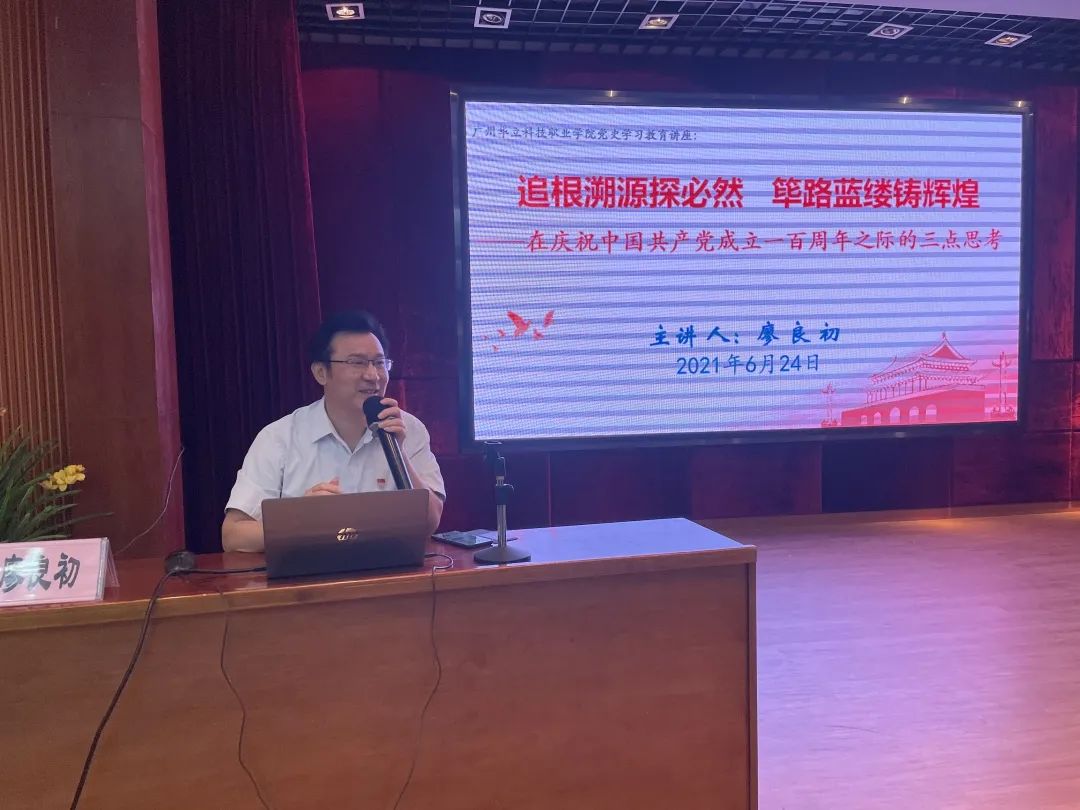 在舉國(guó)上下同慶中國(guó)共產(chǎn)黨成立100周年之際,為扎實(shí)推進(jìn)黨史學(xué)習(xí)教育走深走實(shí),6月24日下午,廣州華立科技職業(yè)學(xué)院黨委在東區(qū)圖書(shū)館1號(hào)報(bào)告廳舉辦黨史學(xué)習(xí)教育專題報(bào)告會(huì),邀請(qǐng)黨史專家、我校馬克思主義學(xué)院常務(wù)副院長(zhǎng)廖良初教授作專題輔導(dǎo)報(bào)告。學(xué)校黨委委員、校領(lǐng)導(dǎo)、中層干部、黨務(wù)干部、思政課教師和七一表彰對(duì)象參加。會(huì)議由學(xué)校黨委書(shū)記林偉健教授主持。云浮校區(qū)以視頻連線方式一同參加。
