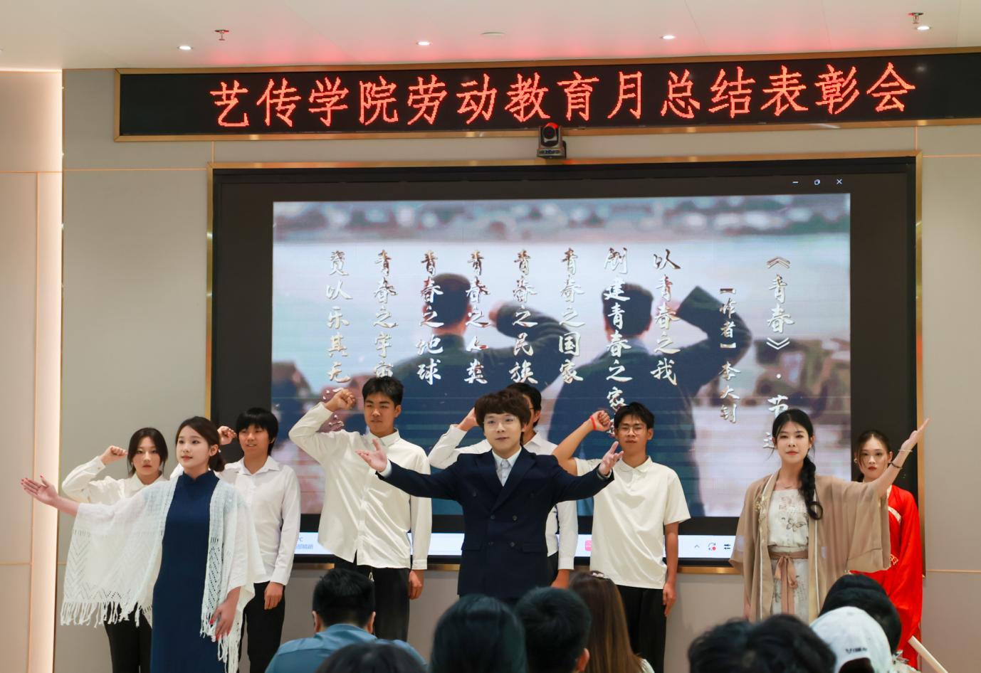 中華經(jīng)典誦讀作為勞動(dòng)月教育的的優(yōu)秀成果之一,作為了本次表彰大會(huì)的開(kāi)場(chǎng)節(jié)目。在誦讀過(guò)程中,11 位同學(xué)搭檔配合,用激昂的聲音、真摯的情感,聲情并茂地展現(xiàn)了經(jīng)典文學(xué)作品的魅力,傳遞了愛(ài)國(guó)、奮斗、青春等正能量,贏得了現(xiàn)場(chǎng)陣陣掌聲。