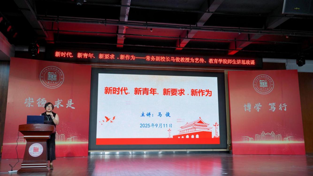 秋意漸濃啟新程,思想領(lǐng)航聚力量。 9 月 11 日晚 6 點(diǎn),學(xué)校常務(wù)副校長馬俊教授以“新時(shí)代、新青年、新要求、新作為”為主題,在圖書館八樓報(bào)告廳為藝術(shù)與傳媒學(xué)院、教育學(xué)院的700名師生代表們講授了“思政第一課”。馬俊教授用深刻的理論闡釋、鮮活的實(shí)踐案例,為在場師生打造了一堂兼具思想深度與情感溫度的思政課。