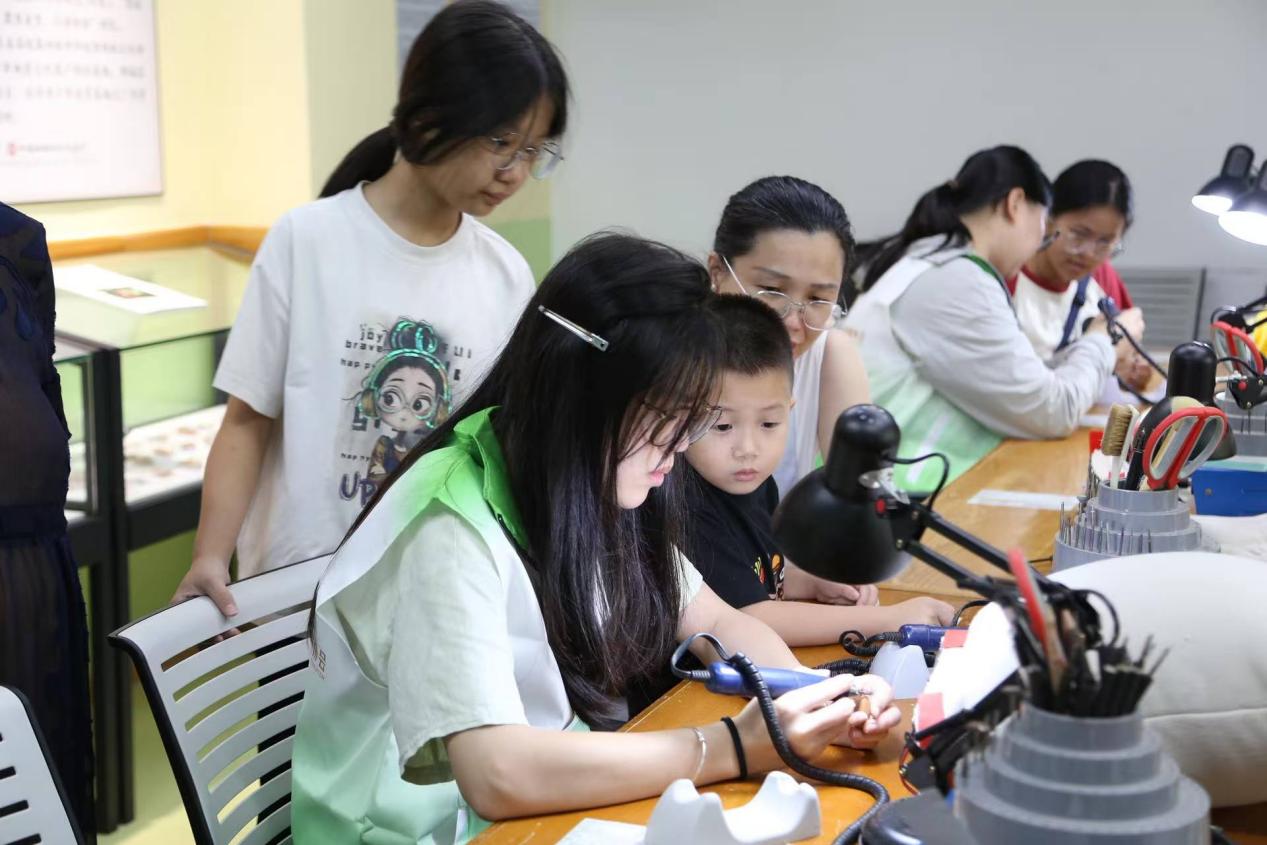 隨后,在師生志愿者的引導(dǎo)下,參觀人員了解認(rèn)識(shí)欖雕原材料,近距離觀摩匠人的雕刻技藝,并細(xì)細(xì)品味精美的欖雕作品。志愿者生動(dòng)細(xì)致的講解,輔以沉浸式的互動(dòng)體驗(yàn),使大家逐步領(lǐng)略到這項(xiàng)傳統(tǒng)技藝的藝術(shù)精髓與文化底蘊(yùn)。