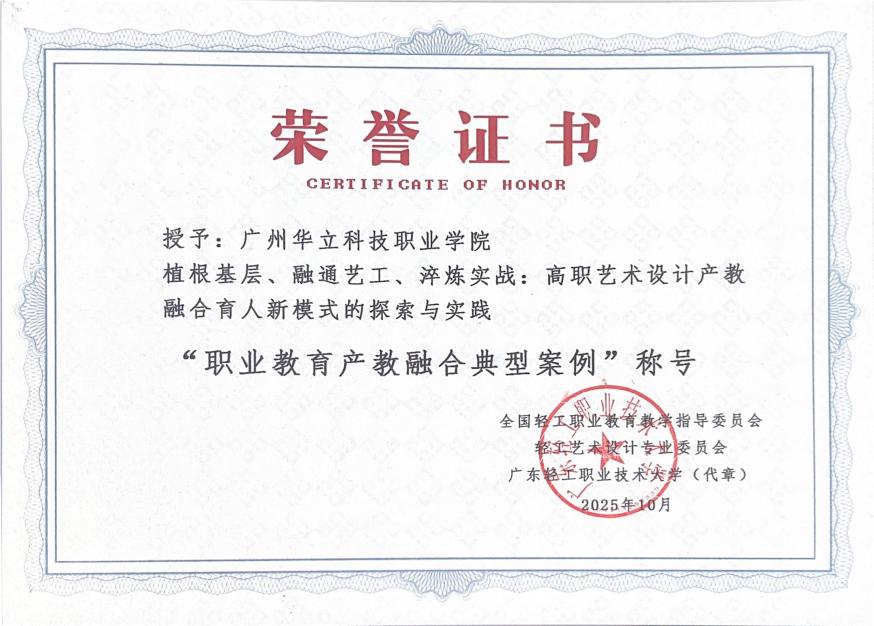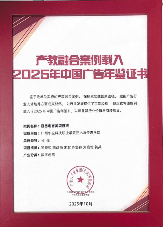 此次研討會(huì)是華立職院在藝術(shù)設(shè)計(jì)教育創(chuàng)新和產(chǎn)教融合方面邁出的重要一步。經(jīng)全國(guó)輕工藝術(shù)設(shè)計(jì)專(zhuān)業(yè)委員會(huì)和共同體專(zhuān)家評(píng)審:由馬俊 、肖釗俊、沈泓睿、王渡讀團(tuán)隊(duì)制作的紀(jì)錄片榮獲中國(guó)大學(xué)生廣告藝術(shù)學(xué)院獎(jiǎng) 2025年“筑夢(mèng)產(chǎn)教·校長(zhǎng)印記”賽項(xiàng)“金獎(jiǎng)”;華立職院產(chǎn)教融合案例“植根基層、融通藝工、淬煉實(shí)戰(zhàn):高職藝術(shù)設(shè)計(jì)產(chǎn)教融合育人新模式的探索與實(shí)踐”榮獲“產(chǎn)教融合典型案例”;華立職院藝術(shù)與傳媒學(xué)院黨總支書(shū)記陳改梅、就業(yè)主任黎映如獲聘“全國(guó)輕工藝術(shù)設(shè)計(jì)專(zhuān)委會(huì)智庫(kù)專(zhuān)家”;華立職院“冠岳宅吉美項(xiàng)目班”產(chǎn)教融合案例,正式載入《2025年中國(guó)廣告年鑒》,以彰顯其行業(yè)價(jià)值與引領(lǐng)意義;學(xué)校獲評(píng)創(chuàng)意星大學(xué)生實(shí)踐人才培育工程-廣州華立科技職業(yè)學(xué)院網(wǎng)易傳媒新媒體人才孵化計(jì)劃實(shí)訓(xùn)單位。