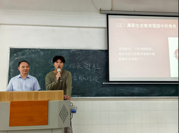 廖校長在最后總結(jié)時寄語,職業(yè)教育現(xiàn)代化是教育現(xiàn)代化的重要基石,高職青年應(yīng)秉持精益求精的工匠精神和愛崗敬業(yè)的職業(yè)態(tài)度,在實現(xiàn)中國式現(xiàn)代化征程中貢獻“職教力量”。