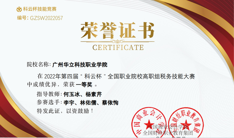 學(xué)生參加“科云杯”全國(guó)職業(yè)院校稅務(wù)技能大賽獲得一等獎(jiǎng)
