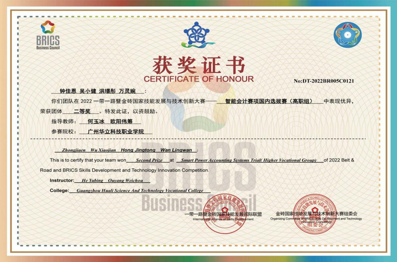學(xué)生參加一帶一路暨金磚國(guó)家技能大賽“智能會(huì)計(jì)”賽項(xiàng)全國(guó)二等獎(jiǎng)