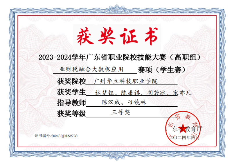 學(xué)生參加省級(jí)技能大賽“業(yè)財(cái)稅融合大數(shù)據(jù)應(yīng)用” 賽項(xiàng)獲得三等獎(jiǎng)
