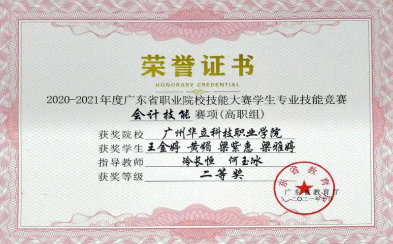 冷長(zhǎng)恒、何玉冰老師指導(dǎo)學(xué)生參加省級(jí)職業(yè)技能(會(huì)計(jì)技能)競(jìng)賽獲得二等獎(jiǎng)