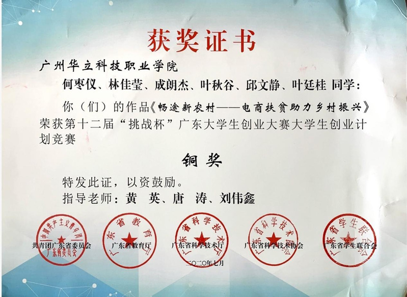 第十二屆“挑戰(zhàn)杯”廣東大學生創(chuàng)業(yè)大賽大學生創(chuàng)業(yè)計劃競賽銅獎